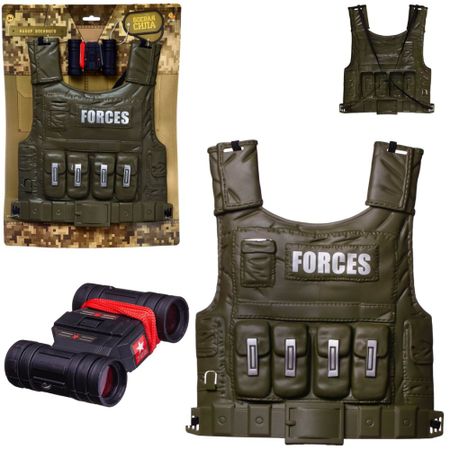 Игровой набор из серии «Боевая сила» от бренда ABtoys станет отличным подарком для любого мальчика. В его составе военный жилет и бинокль. Жилет изготовлен из достаточно мягкого пластика, ему предана объемная форма, сымитированы карманы, ремни, клапаны. Ребенок сможет легко его одеть на себя, используя специальные лямки-резинки. В играх с биноклем мальчик проявит свою фантазию, потренирует наблюдательность. Бинокль никогда не потеряется, так как в комплекте есть удобный шнурок, чтобы повесить его на шею. Используя предметы из военного набора, мальчик сможет разыграть множество захватывающих сюжетов на военную тему, проявить воображение, примерить на себя роль настоящего бойца.Размер жилета: 29х4,5х31,5 см. Толщина материала 1-1,5см.Размер бинокля: 8,5х2,5х6 см.В состав набора входят: военный жилет, бинокль.Материал: полимерный материал, текстиль.