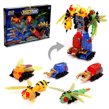 Набор инерционных роботов «Команда насекомых», трансформируются, собираются в одного робота. В глубинах космоса родилась идея о создании защитника галактики. Пять машинок наделили способностью трансформироваться и объединять свои силы, чтобы стать могучим роботом! <b> Объединение перед лицом угрозы</b> Родной дом автоботов оказался на грани разрушения от страшного метеоритного дождя. Пять машинок вновь соединились в могучего робота и отразили опасную космическую атаку! <b> Особенности</b> <ul> <li> Размер могучего робота: 15 × 9 × 26,5 см.</li> <li> Размер осы: 11 × 16,5 × 3,5 см (16,5 см — ширина по крыльям).</li> <li> Размер стрекозы: 12,5 × 12,5 × 3,5 см (12,5 см — ширина по крыльям).</li> <li> Размер красного жука: 11,5 × 5,7 × 4,5 см.</li> <li> Размер синего жука: 10,7 × 5,7 × 4,8 см.</li> <li> Размер оранжевого жука: 10,5 × 7 × 4 см.</li> <li> Дополнительно в комплект входит 5 игровых карточек размером 5,5 × 8,5 см.</li> <li> В каждую машинку встроен инерционный механизм. Он позволяет задать транспорту скорость и дает возможность двигаться самостоятельно, по инерции.</li> <li> Все элементы изготовлены из качественного, безопасного для детей пластика.</li> <li> Предназначены для детей старше 3 лет.</li> </ul> <b> Увлекательно и полезно</b> Игра с роботом способствует развитию мелкой моторики рук, помогает улучшить координацию и точность движений. Кроме того, процесс трансформации машинок в робота стимулирует творческие способности ребенка и воображение, позволяет создавать новые уникальные сценарии и истории для игры.