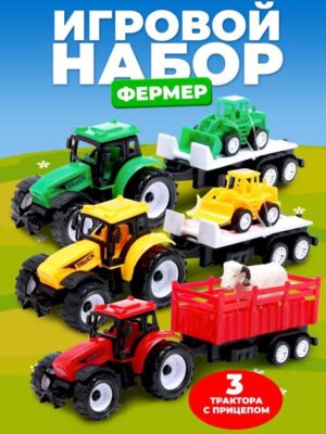 Набор инерционных тракторов «Фермер» с прицепом, 3 штуки. Создавайте увлекательные фермерские приключения с набором тракторов с прицепами!<br> Этот яркий набор из трех инерционных машинок подарит детям массу удовольствия и позволит придумать увлекательные сценарии игры на ферме. <strong> Особенности набора</strong> <ul> <li> Рекомендовано для детей от 3 лет.</li> <li> В наборе: 3 инерционных трактора с прицепами, а также минитракторы и фигурка животного.</li> <li> Прицепы можно легко отцепить и снова присоединить для разнообразия игры.</li> <li> Тракторы выполнены в насыщенных цветах, которые привлекают внимание ребенка.</li> <li> Прочный пластик.</li> </ul> <strong> Играем с пользой</strong> <ul> <li> Развитие воображения: ребенок придумывает интересные сценарии, развивая фантазию и творческие навыки.</li> <li> Мелкая моторика: игры с машинками и прицепами способствуют развитию координации движений и моторики рук.</li> <li> Познавательный процесс: ребенок знакомится с техникой и жизнью на ферме, расширяя кругозор.</li> </ul> Набор тракторов с прицепами станет отличным подарком для маленьких любителей техники и фермерских приключений, делая игру веселой и увлекательной!