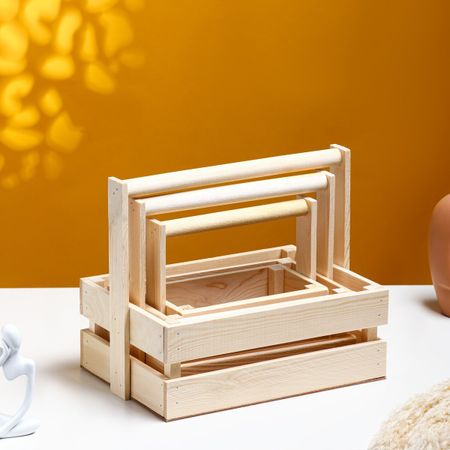 Набор кашпо деревянных подарочных "Модерн", 3 в 1, с ручкой, натуральный. Кашпо можно использовать как функциональную упаковку для подарка, подставку под цветы игрушки и разнообразные мелочи, в качестве украшения интерьера. Оно подходит как для живых, так и для искусственных цветов. Размеры кашпо: <ul> <li> большое — 20 x 21 x 9/27 см;</li> <li> среднее — 25 x 16 x 9/24 см;</li> <li> малое — 20 x 11 x 9/20 см.</li> </ul>