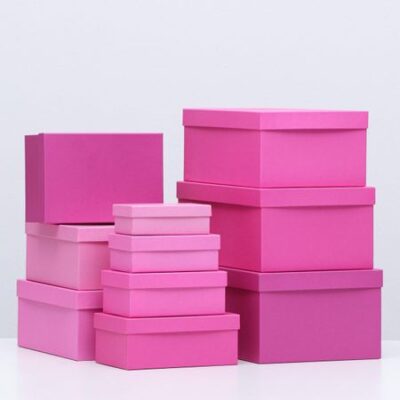 Набор коробок 10 в 1 «Пантон 230», 30.5×20×13 — 12×6.5×4 см. Набор из 10 коробок в розовых и сиреневых тонах — это универсальное решение для упаковки подарков или хранения мелочей. Коробки выполнены в однотонном дизайне, что делает их подходящими для любого праздника или повода. Плотный картон обеспечивает надежность, а лаконичная прямоугольная форма добавляет эстетичности. <b> Особенности</b> <ul> <li> В набор входят 10 коробок разных размеров, от больших (30,5 × 20 × 13 см) до компактных (12 × 6,5 × 4 см).</li> <li> Плотность материала (750 г/м²) гарантирует прочность и долговечность.</li> <li> Однотонная цветовая гамма сочетается с любым стилем оформления.</li> <li> Универсальная тематика подходит для любых праздников и событий.</li> </ul> <b> Для чего использовать?</b> Набор идеально подойдет для упаковки подарков, хранения канцелярии, украшений или других мелочей. Разные размеры коробок позволяют организовать пространство на полке, столе или в шкафу. Их можно использовать дома, в офисе или для оформления мероприятий. <b> Почему это удобно?</b> Коробки из набора легко комбинируются между собой, создавая гармоничную композицию. Их можно украшать лентами, наклейками или рисунками, добавляя индивидуальности. Набор станет практичным решением для тех, кто ценит порядок и стиль. Все размеры коробок: 30,5 х 20 х 13 см, 28,5 х 18,5 х 12 см, 26 х 17,5 х 11 см, 23,5 х 15,5 х 10 см, 21 х 14 х 9 см, 19 х 13 х 8 см, 17,5 х 11 х 7 см, 15 х 9,5 х 6 см, 13,5 х 8 х 5 см, 12 х 6,5 х 4 см