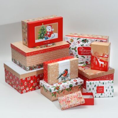 Набор коробок 10 в 1 «Уютный», 12 х 7 х 4 ‒ 32.5 х 20 х 12.5 см, Новый год. <b> В набор входят 10 коробок разного размера:</b> <ul> <li> 12 × 7 × 4 см;</li> <li> 14 × 8,4 × 4,5 см;</li> <li> 15 × 9,5 × 5,5 см;</li> <li> 18 × 11 × 6,5 см;</li> <li> 20 × 12,5 × 7,5 см;</li> <li> 22 × 14 × 8,5 см;</li> <li> 24 × 15,5 × 9,5 см;</li> <li> 26 × 17 × 10,5 см;</li> <li> 28 × 18,5 × 11,5 см;</li> <li> 32,5 × 20 × 12,5 см.</li> </ul>