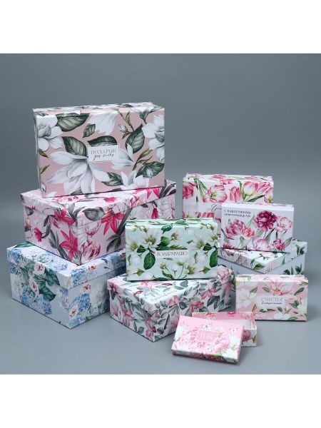 Набор коробок 10 в 1, упаковка подарочная, «Цветочный сад», 12 х 7 х 4 — 32.5 х 20 х 12.5 см. Размеры коробок: — 12 х 7 х 4 см — 14 х 8.4 х 4.5 см — 15 х 9.5 х 5.5 см — 18 х 11 х 6.5 см — 20 х 12.5 х 7.5 см — 22 х 14 х 8.5 см — 24 х 15.5 х 9.5 см — 26 х 17 х 10 см — 28 х 18.5 х 11.5 см — 32.5 х 20 х 12.5 см