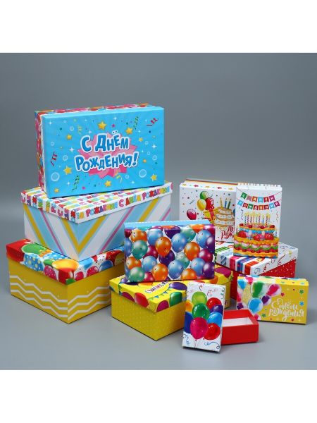 Набор коробок 10 в 1, упаковка подарочная, «С днем рождения», 12 х 7 х 4 — 32.5 х 20 х 12.5 см. Размеры коробок: — 12 х 7 х 4 см — 14 х 8.4 х 4.5 см — 15 х 9.5 х 5.5 см — 18 х 11 х 6.5 см — 20 х 12.5 х 7.5 см — 22 х 14 х 8.5 см — 24 х 15.5 х 9.5 см — 26 х 17 х 10 см — 28 х 18.5 х 11.5 см — 32.5 х 20 х 12.5 см