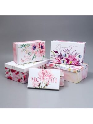 Набор коробок 5 в 1, упаковка подарочная, «Цветы», 22 х 14 х 8.5‒ 32.5 х 20 х 12.5 см. Размеры коробок: — 22 х 14 х 8.5 см — 24 х 15.5 х 9.5 см — 26 х 17 х 10 см — 28 х 18.5 х 11.5 см — 32.5 х 20 х 12.5 см
