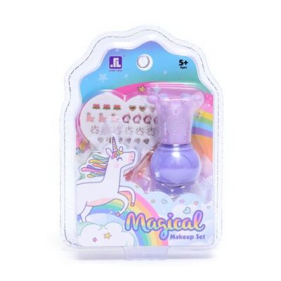 Набор косметики для девочки «Волшебный единорог» с наклейками включает в себя:Лак для ногтей: Этот яркий лак позволяет создавать волшебные маникюры, придавая ногтям красочные оттенки.Наклейки на ногти: Декоративные наклейки с изображением единорогов и других волшебных элементов, чтобы добавить волшебства и креативности вашему маникюру.Этот набор предоставляет маленьким модницам возможность творчески выражаться, создавать красочные образы и украшать свои ногти в стиле волшебного единорога. Легко смывается водой, что делает его безопасным и удобным в использовании для детей.