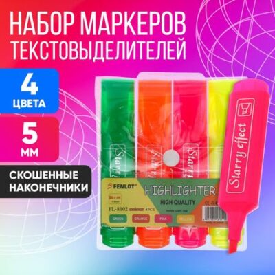 Набор маркеров-текстовыделителей, 4 цвета, 5 мм. <b> Набор Текстовыделителей предназначен для выделения текста на бумаге любого типа, включая факс — бумагу.</b> Необходимый помощник школьника, студента и любого человека, который вдумчиво работает с текстом. Расставить яркие акценты в лекции, выделить главные тезисы в документе, подготовить речь — именно для этого был придуман текстовыделитель. <b> 4 цвета.</b> <li> Скошенный наконечник имеет толщину линии письма от 1 до 5 мм, что обеспечивает удобство при работе с текстом, напечатанным мелким шрифтом, или таблицами.</li> <li> Благодаря особой водной основе чернил текстовыделители не высыхают без колпачка в течение 8 часов.</li> <li> Текстовыделители обладают экономным расходом чернил, при этом длина линии письма достигает 250 метров.</li> <li> Чернила быстро впитываются и тем самым предотвращают размазывание в процессе использования.</li> <li> Этот маркер подходит для всех видов бумаги и не выцветает со временем.</li> <li> Изделия не перезаправляются.</li>