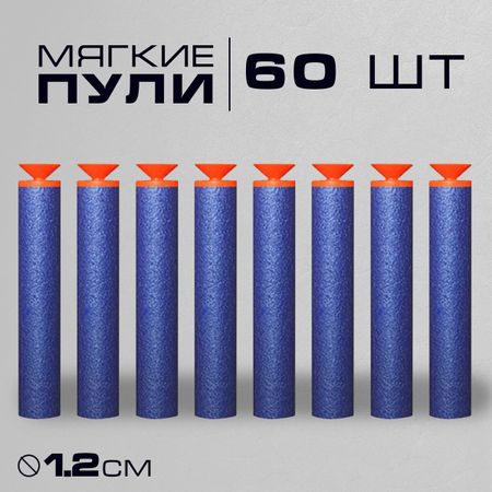 Набор мягких пуль с присосками, 60 штук. Набор мягких пуль с присосками — идеальный аксессуар для увлекательных игр с бластерами. Эти пули обеспечат безопасный игровой процесс, а их высокое качество порадует как детей, так и взрослых. <strong> Особенности</strong> <ul> <li> Подходит для детей от 3 лет.</li> <li> Количество пуль: 60 штук — хватит на продолжительные игровые сессии.</li> <li> Присоски на наконечниках: обеспечивают надежное крепление к ровным поверхностям, добавляя разнообразие в игры.</li> <li> Мягкий материал: пули выполнены из вспененного материала, который не деформируется при использовании.</li> <li> Безопасность: пули подходят для детей благодаря мягкости и безопасному наконечнику.</li> </ul> <strong> Играем с пользой</strong> Мягкие пули с присосками помогут сделать игры с бластерами еще увлекательнее. Они развивают координацию, меткость и ловкость, а также способствуют физической активности и командным взаимодействиям. С таким набором ребенок сможет погрузиться в мир активных игр и весело провести время с друзьями!