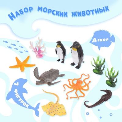 Набор морских животных «Морской мир», 7 фигурок , декор. Набор морских животных «Морской мир» с 7 фигурками и элементами декора станет отличным подарком для юного исследователя! Этот набор позволит ребенку создать уникальный подводный сюжет и познакомиться с удивительными обитателями океана. <strong> Особенности набора</strong> <ul> <li> Подходит для детей от 3 лет.</li> <li> В комплект входят 7 фигурок: морская звезда, черепаха, скат, осьминог, морской конек и два пингвина.</li> <li> Дополнен элементами декора, такими как кораллы и водоросли, для создания реалистичного игрового пространства.</li> <li> Яркие цвета и детализированный дизайн привлекают внимание.</li> <li> Изготовлен из прочного и безопасного пластика.</li> </ul> <strong> Игра и польза</strong> <ul> <li> Пробуждает интерес к морским обитателям и их среде обитания.</li> <li> Стимулирует воображение и помогает придумывать увлекательные игровые сценарии.</li> <li> Развивает мелкую моторику и тактильные навыки.</li> <li> Подходит для сюжетно-ролевых игр и коллекционирования.</li> </ul> Набор «Морской мир» подарит ребенку массу радостных моментов, вдохновляя на изучение подводной жизни и увлекательные игры!