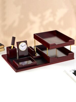 Набор настольный 5в1 с часами, вишня. Порой рабочий стол настолько загружен, что негде расписаться или составить документ от руки. А на большинство людей беспорядок действует негативно, снижает концентрацию и продуктивность. Компактный настольный набор поможет избежать хаоса на рабочем месте. Храните в нем канцелярские принадлежности или другие мелочи, чтобы правильно организовать пространство. К тому же изделие имеет минималистичный дизайн и выполнено под дерево, поэтому оно украсит собой любое место как декоративный элемент. С помощью такого аксессуара можно поздравить сотрудников, руководство, деловых партнеров, также он подойдет в качестве подарка учителям и преподавателям.