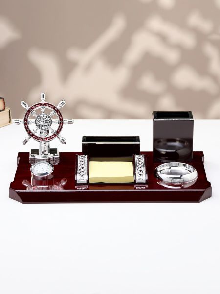 Набор настольный 6в1 с визитницей, красное дерево. Порой рабочий стол настолько загружен, что негде расписаться или составить документ от руки. А на большинство людей беспорядок действует негативно, снижает концентрацию и продуктивность. Компактный настольный набор поможет избежать хаоса на рабочем месте. Храните в нем канцелярские принадлежности или другие мелочи, чтобы правильно организовать пространство. К тому же изделие имеет минималистичный дизайн и выполнено под дерево, поэтому оно украсит собой любое место как декоративный элемент. С помощью такого аксессуара можно поздравить сотрудников, руководство, деловых партнеров, также он подойдет в качестве подарка учителям и преподавателям.