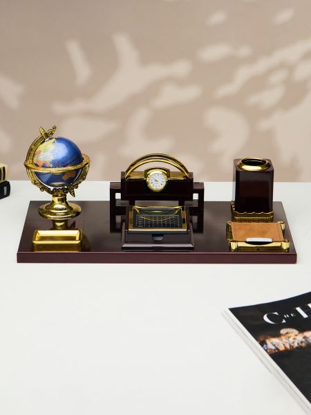 Набор настольный 7в1(блок д/бум,подст.д/печати,карандашница, кальк, глобус, визитн с часами). Порой рабочий стол настолько загружен, что негде расписаться или составить документ от руки. А на большинство людей беспорядок действует негативно, снижает концентрацию и продуктивность. Компактный настольный набор поможет избежать хаоса на рабочем месте. Храните в нем канцелярские принадлежности или другие мелочи, чтобы правильно организовать пространство. К тому же изделие имеет минималистичный дизайн и выполнено под дерево, поэтому оно украсит собой любое место как декоративный элемент. С помощью такого аксессуара можно поздравить сотрудников, руководство, деловых партнеров, также он подойдет в качестве подарка учителям и преподавателям.