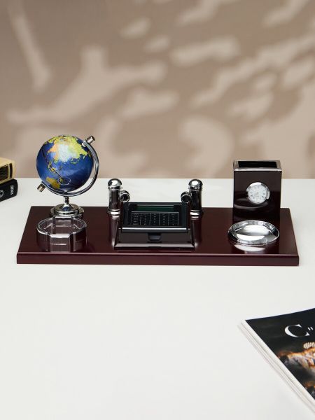 Набор настольный 7в1 (блок д/бумаг,подст.д/печати,мелочей,каранд-ца,часы,визит-ца,глобус). Порой рабочий стол настолько загружен, что негде расписаться или составить документ от руки. А на большинство людей беспорядок действует негативно, снижает концентрацию и продуктивность. Компактный настольный набор поможет избежать хаоса на рабочем месте. Храните в нем канцелярские принадлежности или другие мелочи, чтобы правильно организовать пространство. К тому же изделие имеет минималистичный дизайн и выполнено под дерево, поэтому оно украсит собой любое место как декоративный элемент. С помощью такого аксессуара можно поздравить сотрудников, руководство, деловых партнеров, также он подойдет в качестве подарка учителям и преподавателям.