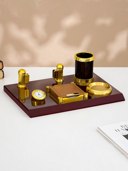 Набор настольный, органайзер 5 в 1 с визитницей и часами, красное дерево. Порой рабочий стол настолько загружен, что негде расписаться или составить документ от руки. А на большинство людей беспорядок действует негативно, снижает концентрацию и продуктивность. Компактный настольный набор поможет избежать хаоса на рабочем месте. Храните в нем канцелярские принадлежности или другие мелочи, чтобы правильно организовать пространство. К тому же изделие имеет минималистичный дизайн и выполнено под дерево, поэтому оно украсит собой любое место как декоративный элемент. С помощью такого аксессуара можно поздравить сотрудников, руководство, деловых партнеров, также он подойдет в качестве подарка учителям и преподавателям.