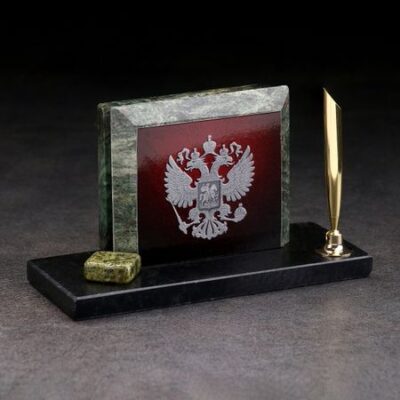Набор настольный "Герб на красном фоне", змеевик. Змеевик — минерал, имеющий глянцевый блеск и характерный окрас с темными пятнами и полосками. Камень используется в отделке печей, что свидетельствует о его прочности и устойчивости к высокой температуре, поэтому изделия из змеевика прослужат вам долго.