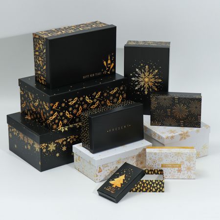 Набор новогодних подарочных коробок 10 в 1 «Золотой», 12 х 7 х 4‒32.5 х 20 х 12.5 см, Новый год. <b> В набор входят 10 коробок разного размера:</b> <ul> <li> 12 × 7 × 4 см;</li> <li> 14 × 8,4 × 4,5 см;</li> <li> 15 × 9,5 × 5,5 см;</li> <li> 18 × 11 × 6,5 см;</li> <li> 20 × 12,5 × 7,5 см;</li> <li> 22 × 14 × 8,5 см;</li> <li> 24 × 15,5 × 9,5 см;</li> <li> 26 × 17 × 10,5 см;</li> <li> 28 × 18,5 × 11,5 см;</li> <li> 32,5 × 20 × 12,5 см.</li> </ul>