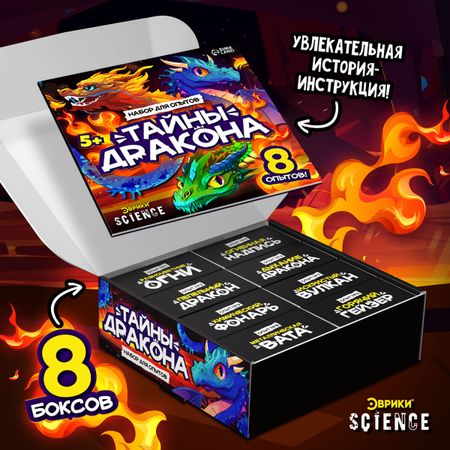 Набор опытов «Тайны дракона», 8 опытов. Набор для опытов «Тайны дракона» от торговой марки «Эврики» – это увлекательный способ для детей от 5 лет узнать о драконах и их истории. В наборе содержится 8 опытов, которые позволят детям самостоятельно провести научные эксперименты и узнать, как работает наука. <b> В наборе представлены следующие опыты</b> <ol> <li> Разноцветные огни</li> <li> Пепельный дракон</li> <li> Химический фонарь</li> <li> Огненная надпись</li> <li> Дыхание дракона</li> <li> Горячий гейзер</li> <li> Искристый вулкан</li> <li> Металлическая вата</li> </ol> <b> Преимущества</b> <ul> <li> Увлекательный и познавательный способ узнать о драконах и их истории.</li> <li> Возможность самостоятельно провести научные эксперименты.</li> <li> Качественные материалы и безопасные реактивы.</li> </ul> <b> Рекомендации</b> <ul> <li> Перед началом проведения опытов внимательно прочитайте инструкцию.</li> <li> Соблюдайте меры безопасности.</li> <li> Используйте только те реактивы, которые указаны в инструкции.</li> </ul> <b> Заключение</b> Набор для опытов «Тайны дракона» – это отличный подарок для детей, которые любят драконов и хотят узнать о них больше. Набор позволит детям провести увлекательные эксперименты и узнать, как работает наука.