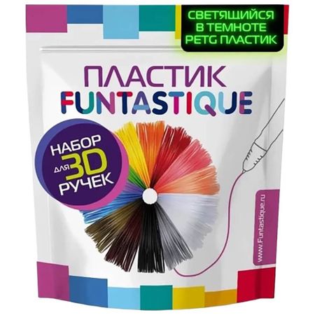 Комплект светящегося в темноте PETG-пластика для 3D-ручек Funtastique подходит для изготовления сувениров и моделей для творчества. С помощью пластика можно создавать не только фигуры, но и наносить рисунок на стекло. Температура плавления около 180-210 °С. Особенности Свечение в темноте В составе содержится Люминофор — люминесцентный пигмент, который обеспечивает свечение в темноте. Подержите пластик возле сильного источника света в течении некоторого времени, и он засияет яркими красками. Пластик светится ярко в течении первых 45 минут, потом свечение потихоньку уменьшается. Для возобновления свечения поместите изделия рядом с ярким источником света. Количество циклов подзарядки пластика не ограничено. Чтобы увидеть свечение достаточно полумрака, полная темнота не требуется. Для улучшения светоотражающих характеристик материала рекомендуется печатать полностью заполненные модели (без полостей) Безопасность Пластик не радиоактивен, не токсичен, безопасен для человека. Стоит избегать попадания на пластик влаги, а также прямых солнечных лучей Внимание Цвета в ассортименте, комплектуются в набор случайным образом