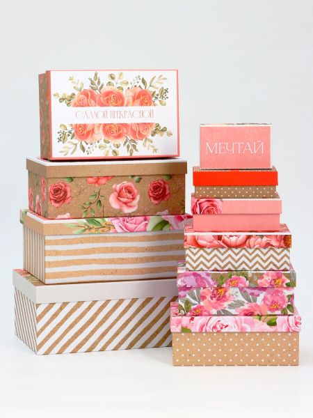 Набор подарочных коробок 10 в 1 Flowers, 32.5×20×12.5 — 12×7×4 см. <strong> Набор подарочных коробок "Flowers" – это идеальный выбор для тех, кто ищет милые и стильные упаковки для подарков на любой праздник.</strong> В набор входит десять коробок разного размера, начиная от самой большой 32,5 х 20 х 12,5 см и заканчивая самой маленькой 12 х 7 х 4 см. Такое разнообразие размеров позволяет выбрать подходящую коробку для любого подарка, будь то украшение, косметика, книга или что-то другое. Каждая коробка украшена нежными цветочными мотивами, которые создадут ощущение весенней свежести и радости. Эти милые рисунки добавят очарования любому подарку и сделают его еще более запоминающимся. Материалы высокого качества гарантируют, что коробки сохранят свой внешний вид даже после длительного использования. Этот набор станет отличным выбором для девушки, которая ценит красоту и внимание к деталям. Упакованные в такие коробки подарки обязательно вызовут улыбку и оставят теплые воспоминания о любом празднике.