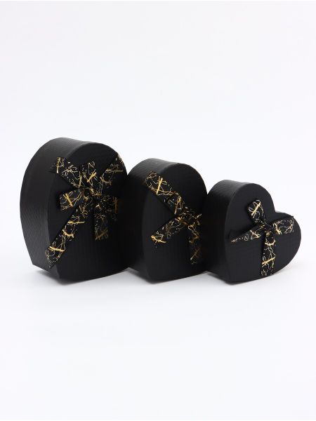 Набор подарочных коробок сердце 3 в 1, черный с бантом, 22×20×9; 18.5×17×7.5; 16×14×6 см. <strong> Набор коробок «Сердца» в трех размерах</strong> — идеальный выбор для хранения и презентации ваших любимых вещей. Эти элегантные коробки выполнены из высококачественного картона и бумаги. <strong> Представлены в трех разных размерах:</strong> <ul> <li> 22x20x9 см,</li> <li> 19x17x7,5 см</li> <li> 16x14x6 см.</li> </ul> Благодаря своей уникальной форме в виде сердец, эти коробки станут прекрасным дополнением к любому интерьеру и подчеркнут вашу индивидуальность. Они идеально подходят для хранения ювелирных изделий, косметики, аксессуаров, книг, сувениров и других предметов, которые требуют особого внимания и заботы. Набор коробок «Сердца» станет отличным подарком для ваших близких и друзей, ведь он сочетает в себе стиль, качество и функциональность. Эти коробки прослужат долгое время и будут радовать вас своим внешним видом и удобством использования.