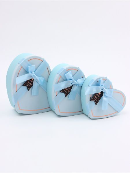 Набор подарочных коробок сердце 3 в 1, голубой с бантом, 22×20×9; 18.5×17×7.5; 16×14×6 см. <strong> Набор коробок «Сердца» в трех размерах</strong> — идеальный выбор для хранения и презентации ваших любимых вещей. Эти элегантные коробки выполнены из высококачественного картона и бумаги. <strong> Представлены в трех разных размерах:</strong> <ul> <li> 22x20x9 см,</li> <li> 19x17x7,5 см</li> <li> 16x14x6 см.</li> </ul> Благодаря своей уникальной форме в виде сердец, эти коробки станут прекрасным дополнением к любому интерьеру и подчеркнут вашу индивидуальность. Они идеально подходят для хранения ювелирных изделий, косметики, аксессуаров, книг, сувениров и других предметов, которые требуют особого внимания и заботы. Набор коробок «Сердца» станет отличным подарком для ваших близких и друзей, ведь он сочетает в себе стиль, качество и функциональность. Эти коробки прослужат долгое время и будут радовать вас своим внешним видом и удобством использования.