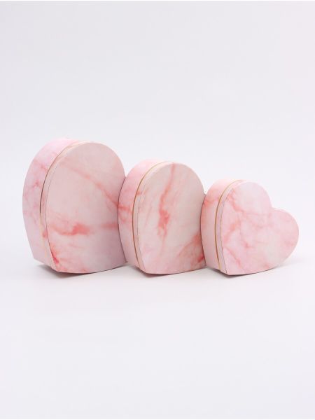 Набор подарочных коробок сердце 3 в 1, розовый мрамор, 22×20×9; 18.5×17×7.5; 16×14×6 см. <strong> Набор коробок «Сердца» в трех размерах</strong> — идеальный выбор для хранения и презентации ваших любимых вещей. Эти элегантные коробки выполнены из высококачественного картона и бумаги. <strong> Представлены в трех разных размерах:</strong> <ul> <li> 22x20x9 см,</li> <li> 19x17x7,5 см</li> <li> 16x14x6 см.</li> </ul> Благодаря своей уникальной форме в виде сердец, эти коробки станут прекрасным дополнением к любому интерьеру и подчеркнут вашу индивидуальность. Они идеально подходят для хранения ювелирных изделий, косметики, аксессуаров, книг, сувениров и других предметов, которые требуют особого внимания и заботы. Набор коробок «Сердца» станет отличным подарком для ваших близких и друзей, ведь он сочетает в себе стиль, качество и функциональность. Эти коробки прослужат долгое время и будут радовать вас своим внешним видом и удобством использования.