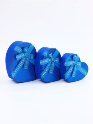 Набор подарочных коробок сердце 3 в 1, сияющий синий с бантом «Любовь вечна», 22×20×9; 18.5×17×7.5; 16×14×6 см. <strong> Набор коробок «Сердца» в трех размерах</strong> — идеальный выбор для хранения и презентации ваших любимых вещей. Эти элегантные коробки выполнены из высококачественного картона и бумаги. <strong> Представлены в трех разных размерах:</strong> <ul> <li> 22x20x9 см,</li> <li> 19x17x7,5 см</li> <li> 16x14x6 см.</li> </ul> Благодаря своей уникальной форме в виде сердец, эти коробки станут прекрасным дополнением к любому интерьеру и подчеркнут вашу индивидуальность. Они идеально подходят для хранения ювелирных изделий, косметики, аксессуаров, книг, сувениров и других предметов, которые требуют особого внимания и заботы. Набор коробок «Сердца» станет отличным подарком для ваших близких и друзей, ведь он сочетает в себе стиль, качество и функциональность. Эти коробки прослужат долгое время и будут радовать вас своим внешним видом и удобством использования.
