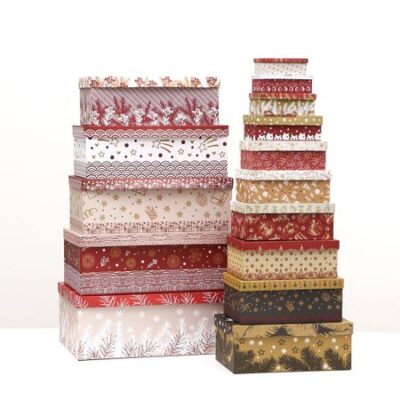 Набор подарочных новогодних коробок 15 в 1 «Изысканность», 47.5×35.5×17.5 — 12×7×4 см. Набор коробок универсальный. Легкие и прочные подарочные коробки изготовлены из гофрокартона и оформлены ламинированной дизайнерской бумагой. Это позволяет упаковке сохранять аккуратный внешний вид в течение длительного времени. Преимущества:- можно использовать не только как упаковку для презента, но и легко встроить в домашнюю систему хранения полезных мелочей <br> Преимущества: <br> — плотный картон; <br> — оригинальное оформление; <br> — удобно при транспортировке.