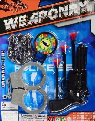 В набор входит пистолет с тремя пульками-присосками, значок, компас, наручники.
