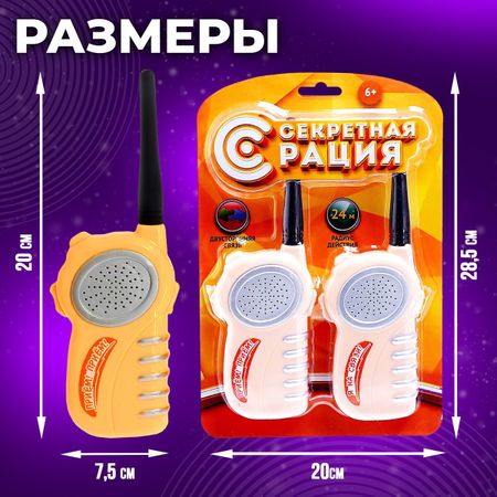 Набор раций «Я на связи», 2 штуки, работает от батареек. Детская рация — переговорное устройство с радиусом действия 24 м. Игрушка выполнена из пластика, имеет стильный дизайн. Переговорное устройство позволит малышу всегда быть на связи с друзьями. Отличный подарок для мальчика! <b> Особенности детской рации </b> <ul> <li> Не содержит вредных красителей. </li> <li> Положение включения — ON, выключения — OFF. </li> <li> Для начала разговора необходимо нажать кнопку PUSH TO TALK. </li> <li> Говорить следует в микрофон, располагая игрушку на расстоянии приблизительно 8 см от рта. </li> <li> Радиус действия: 24 м. </li> <li> Гибкая антенна. </li> </ul> В комплекте 2 переговорных устройства. Тип и количество элементов питания: 3 батарейки типа AA.