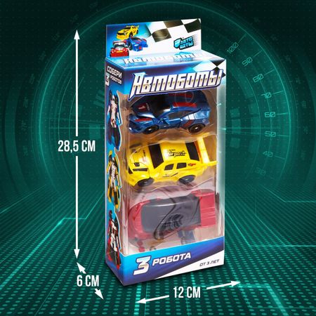 Набор роботов «Автоботы», трансформируются, 3 штуки. Из глубин космоса по заоблачным маршрутам на нашу планету прибыли невероятные гости — роботы «Автоботы». Они способны трансформироваться в машинки и маскироваться среди обычных игрушек! <b> Особенности игрушки</b> <ul> <li> Размер синего робота: 10 × 5,2 × 3 см. В виде машинки: 6,8 × 3 × 10 см.</li> <li> Размер желтого робота: 10 × 5,2 × 3,5 см. В виде машинки: 7,5 × 3,5 × 10,5 см.</li> <li> Размер красного робота: 10 × 5,2 × 4,8 см. В виде машинки: 7 × 4,8 × 10 см.</li> <li> Роботы изготовлены из качественного, безопасного для детей пластика.</li> <li> Предназначены для детей старше 3 лет.</li> </ul> <b> Увлекательно и полезно</b> Игра с роботом способствует развитию мелкой моторики рук, помогает улучшить координацию и точность движений. Кроме того, процесс трансформации робота в животное стимулирует творческие способности ребенка и воображение, позволяет создавать новые уникальные сценарии и истории для игры.