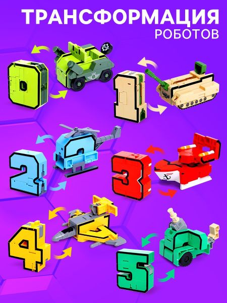 Набор роботов «Робо цифры 0 — 9», трансформируются, 10 роботов в1. Из глубин космоса по заоблачным маршрутам на нашу планету прибыли невероятные гости — «Робоцифры». Их главная особенность — умение трансформироваться из цифр в боевую технику. А в случае особой опасности все 10 роботов собираются в одного большого робота! <b> Особенности игрушки</b> <ul> <li> Размер робота собранном виде: 16 × 10 × 22 см.</li> <li> Роботы изготовлены из качественного, безопасного для детей пластика.</li> <li> Предназначен для детей старше 3 лет.</li> </ul> <b> Увлекательно и полезно</b> Игра с роботом способствует развитию мелкой моторики рук, помогает улучшить координацию и точность движений. Кроме того, процесс трансформации машинок в робота стимулирует творческие способности ребенка и воображение, позволяет создавать новые уникальные сценарии и истории для игры.