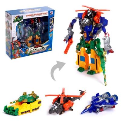 Набор роботов «Военная техника», трансформируется, 3 собираются в 1 робота. В глубинах космоса родилась идея о создании защитника галактики. Танк, вертолет и истребитель наделили способностью трансформироваться и объединять свои силы, чтобы стать одним могучим роботом! <b> Объединение перед лицом угрозы</b> Родной дом автоботов оказался на грани разрушения от страшного метеоритного дождя. Три машинки вновь соединились в могучего робота и отразили опасную космическую атаку! <b> Особенности</b> <ul> <li> Размер в виде робота: 12,5 × 8,5 × 19,5 см.</li> <li> Размер вертолета: 15,5 × 5,5 × 5 см.</li> <li> Размер истребителя: 11,5 × 11,3 × 3,5 см.</li> <li> Размер танка: 12 × 6,5 × 5 см.</li> <li> Размер бинокля: 5,7 × 5 × 2,2 см.</li> <li> Размер автомата: 5,3 × 1,1 × 2 см.</li> <li> Все элементы изготовлены из качественного, безопасного для детей пластика.</li> <li> Предназначены для детей старше 3 лет.</li> </ul> <b> Увлекательно и полезно</b> Игра с роботом способствует развитию мелкой моторики рук, помогает улучшить координацию и точность движений. Кроме того, процесс трансформации машинок в робота стимулирует творческие способности ребенка и воображение, позволяет создавать новые уникальные сценарии и истории для игры.
