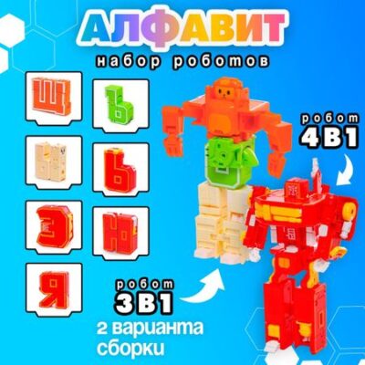 Набор роботов «Алфавит», трансформируются, 7 букв, собираются в 1 робота. Набор роботов «Алфавит» — многофункциональная игрушка для ребенка. Это одновременно большой робот, 7 маленьких букв-роботов: из них 3 робота-животных и 4 робота-пожарных, а также набор букв. <b> Особенности</b> <ul> <li> В наборе 7 роботов, каждый из них может трансформироваться в букву. Робот-медведь — буква «Щ», робот-динозавр — «Ъ», робот-кролик — «Ы», робот-пожарный — «Ь», робот-подъемная пожарная машина — «Э», робот-автоцистерна — «Ю» и робот-машина первой помощи — «Я».</li> <li> Все предметы набора собираются в одного большого робота.</li> <li> Набор развивает воображение и мелкую моторику, а также учит ребенка буквам.</li> <li> Подходит детям от 3 лет.</li> </ul>