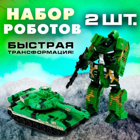 Набор роботов детский «Танковое сражение», трансформируются, в наборе 2 шт.. Танк и робот-трансформер порадуют малыша и займут его надолго! Оба элемента обладают подвижными деталями, которые делают игру более динамичной и интересной. <b> Характеристики</b> <ul> <li> В наборе 2 игрушки: танк и робот с оружием.</li> <li> Робот легко и быстро трансформируется в танк.</li> <li> Размер танка: 24 × 9 × 7,5 см.</li> <li> Размер робота: 10 × 4,5 × 16 см.</li> <li> Размер коробки: 45,5 × 28,5 × 9 см.</li> <li> Набор отлично подойдет в качестве подарка на день рождения, Новый год или 23 Февраля.</li> </ul> <b> Дополнительно</b> Материал игрушек: высококачественный и нетоксичный пластик, устойчивый к износу. <b> Развиваемся, играя</b> Игрушки радуют детей и делают их досуг веселым и увлекательным. А еще они помогают развиваться. Например игра с набором разовьет у малыша моторику, логику и воображение.