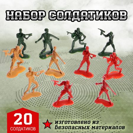 Набор солдатиков «Армия». Набор фигурок «Армия» — группа боевых солдат, вооруженных винтовками и пистолетами, готовых к борьбе за мир и справедливость. Выполнены в ярких цветах: зеленом, красном и желтом. <b> Особенности набора</b> <ul> <li> Солдаты занимают различные боевые позы, готовы к действию в любую секунду.</li> <li> Все фигурки изготовлены из качественного пластика.</li> <li> Размер одного солдатика: 3 × 1 × 4 см. В наборе 20 шт.</li> <li> Подходит для детей от 3 лет.</li> </ul> <b> Увлекательно и полезно</b> Игра с набором солдатиков стимулирует у ребенка тактическое мышление и воображение. Готовы к битве? Пришло время присоединиться к этим отважным бойцам и привести их к победе!