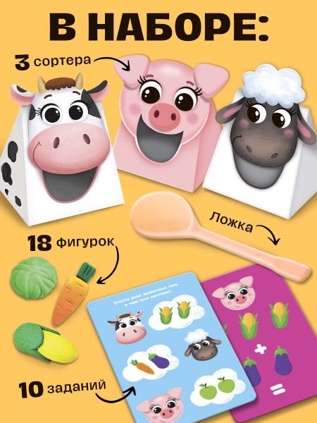 Набор-сортер «Накорми животное. Обед на ферме». Эта игра научит вашего ребенка сортировать предметы по количеству и цветам. Малыш покормит добрых и веселых зверюшек: свинку, коровку и барашка! <b> Как играть?</b> <ul> <li> Соберите коробочки с изображением зверюшек и разложите рядом овощи.</li> <li> Попросите малыша покормить ложечкой каждого зверька. Расскажите ему, чем питается каждый питомец.</li> <li> Используйте для игры карточки с заданиями, обучайте ребенка счету, цветам, развивайте его мышление и моторику!</li> </ul> Набор-сортер «Накорми животное. Обед на ферме» рекомендован детям старше 3 лет. <b> Играйте, развивайтесь и познавайте мир вместе с нами!</b>