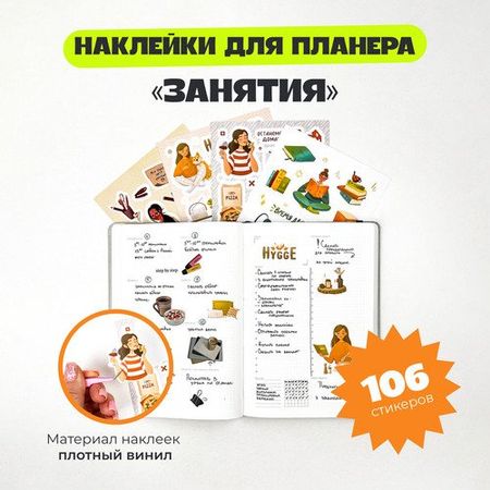 Этот набор включает в себя разнообразные наклейки, которые отражают самые любимые и актуальные занятия в нашей жизни. Чтение любимых книг, время для себя в уютной атмосфере или веселые вечера с близкими. Здесь вы найдете все самое необходимое.