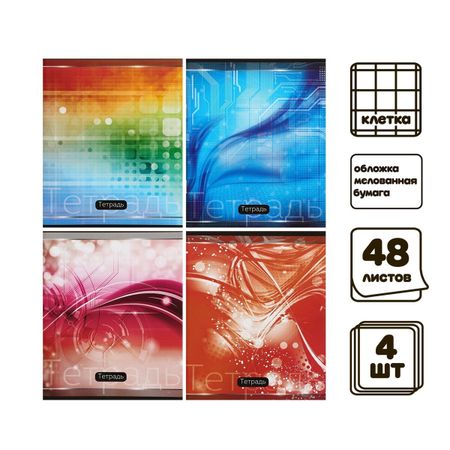 Набор тетрадей 48 листов в клетку Calligrata «Абстракция», обложка мелованная бумага, серые листы, 4 шт.. Комплект тетрадей Calligrata отлично подойдет для любого возраста, пола и рода деятельности. <b> Особенности:</b> <ul> <li> Оригинальный и стильный дизайн.</li> <li> Классическая разметка с полями.</li> <li> Удобное письмо по бумаге.</li> <li> Прочность и надежность.</li> </ul> <b> Характеристики:</b> <ul> <li> Количество листов — 48.</li> <li> Линовка — в клетку.</li> <li> Обложка — мелованная бумага.</li> <li> Блок №2, белизна 75%.</li> <li> Цвет — ассорти.</li> </ul> Комплект тетрадей из 5 штук, 4 уникальных и одна повторяющаяся.