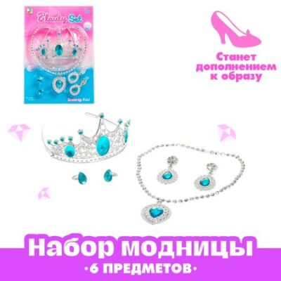 Набор украшений «Нежная принцесса», 6 предметов. Малышка мечтает о балах, ярких платьях и восторженных взглядах? С набором аксессуаров юная леди завершит свой праздничный образ, будет выглядеть неотразимо и очарует всех вокруг! Чтобы стать настоящей звездой вечеринки, достаточно надеть диадему, дополнить наряд сережками, кольцами, ожерельем. Девочка станет увереннее, представит себя маленькой принцессой, придумает и воплотит множество увлекательных сюжетов. Игры с набором способствуют развитию воображения, эмоционального восприятия, мелкой моторики и тактильных ощущений. Наводя красоту, девочка осваивает социальные роли, совершенствует эстетический вкус и проецирует модели поведения взрослых. Рекомендован для детей старше 3 лет.