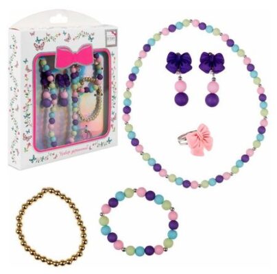 Набор украшений из матовых бусин включает два браслета, клипсы, бусы и колечко. Выполнен в нежных сиреневых тонах с бантиками, придающими аксессуарам утонченность и романтичность.