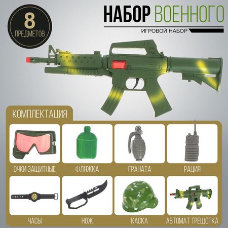Набор военного «Боевая атака», 8 предметов. Что нужно малышу чтобы почувствовать себя настоящим военным? Конечно же, набор оружия "Боевая атака". С такой амуницией мальчика предоставит себя храбрым солдатом, отважным героем и защитником города. Ребенок будет часами играть с предметами, при этом у него разовьются воображение, мышление и эмоциональное восприятие. Изделия изготовлены из безопасных материалов, безвредных для здоровья малютки. Шлем рассчитан на обхват головы ребенка 56 см. Товар предназначен для детей от 3 лет.