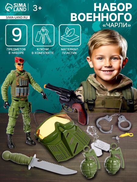 Набор военного «Чарли», 9 предметов. Набор военного «Альфа» станет отличным подарком для юных поклонников военной техники. В комплекте представлены копии гранат, пистолетов и автоматов. Игрушки созданы для детей от 3 лет. <strong> Особенности</strong> <ul> <li> В наборе 9 предметов разного назначения.</li> <li> Игрушки выполнены в камуфляжной раскраске.</li> <li> Простое устройство моделей безопасно для детского использования.</li> <li> Материалы не содержат токсичных веществ.</li> <li> Комплект подходит для игры как в помещении, так и на улице.</li> </ul> <strong> Развитие через игру</strong> Игра с набором поможет маленьким исследователям лучше понять особенности военного дела. Дети смогут создавать сюжетные линии, моделировать различные ситуации и развивать воображение. Набор — это не просто игрушки, а инструмент для формирования начальных представлений о командной работе и дисциплине. Такой комплект станет идеальным дополнением для тематических игр и привлечет внимание мальчиков, увлеченных военной тематикой.