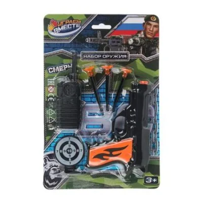 Набор военного ИГРАЕМ ВМЕСТЕ B1863584-R. Набор оружия ТМ «Играем вместе» непременно понравится юному герою.<br> <br> В комплекте:<br> — пистолет<br> — 3 пули на присосках<br> — рация<br> — мишень<br> <br> С этим игровым оружием ваш ребенок будет придумывать увлекательные спецзадания, защищать мир и стоять на страже порядка. С таким пистолетом маленький герой станет самым метким стрелком. Набор подойдет для активных игр на воздухе и в помещении.<br> <br> Игры с оружием ТМ «Играем вместе» помогут развить:<br> — координацию движений<br> — воображение<br> — ловкость и меткость<br> — внимание<br> — моторику<br> <br> Размер: 20 х 15 х 3 см. Материал: пластмасса.<br> Рекомендовано детям от 3-х лет.