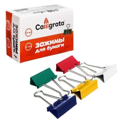 Набор зажимов для бумаг цветных 41 мм, 12 штук, 5 цветов, в картонной коробке. Металлические зажимы для бумаг Calligrata используются для скрепления документов, фотографий без использования степлеров и скрепок, для временной фиксации листов, не повреждая их и надежно удерживая стопку бумаг. Канцелярские зажимы 41 мм из металла. Они являются необходимой офисной принадлежностью, используются в школах и дома <b> Максимальное количество скрепляемых листов: 200</b>