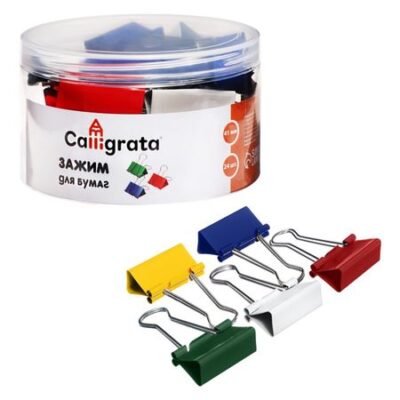 Набор зажимов для бумаг цветных 41 мм, 24 штук, 5 цветов, в пластиковой тубе. Металлические зажимы для бумаг Calligrata используются для скрепления документов, фотографий без использования степлеров и скрепок, для временной фиксации листов, не повреждая их и надежно удерживая стопку бумаг. Канцелярские зажимы 41 мм из металла. Они являются необходимой офисной принадлежностью, используются в школах и дома <b> Максимальное количество скрепляемых листов: 200</b>