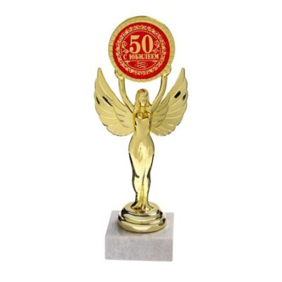 Наградная фигура Ника с вкладышем «С Юбилеем 50», пластик, подставка камень, золото, 18 см. Ника — в древнегреческой мифологии крылатая богиня победы и символ успешного начинания; этот сувенир станет наградой не только за уже свершившиеся успехи, но и на перспективу будущих побед. Сочетание элементов, медали и женской фигуры, в одном кубке — оригинальное решения для наградной фигуры, придется по вкусу тем, кто ценит нестандартные идеи. Фигура изготовлена из пластика, размещена на каменной подставке, вкладыш в медаль выполнен из фольги. Классический дизайн фигуры и торжественный золотой цвет станут отличным украшением церемонии награждения настоящего победителя и помогут ему почувствовать вкус заслуженной победы.