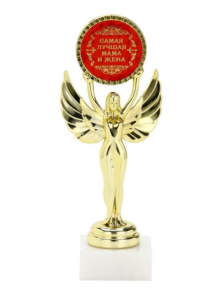 Наградная фигура Ника с вкладышем «Самая лучшая мама и жена», пластик, подставка камень, золото, 18 см. Ника — в древнегреческой мифологии крылатая богиня победы и символ успешного начинания; этот сувенир станет наградой не только за уже свершившиеся успехи, но и на перспективу будущих побед. Сочетание элементов, медали и женской фигуры, в одном кубке — оригинальное решения для наградной фигуры, придется по вкусу тем, кто ценит нестандартные идеи. Фигура изготовлена из пластика, размещена на каменной подставке, вкладыш в медаль выполнен из фольги. Классический дизайн фигуры и торжественный золотой цвет станут отличным украшением церемонии награждения настоящего победителя и помогут ему почувствовать вкус заслуженной победы.