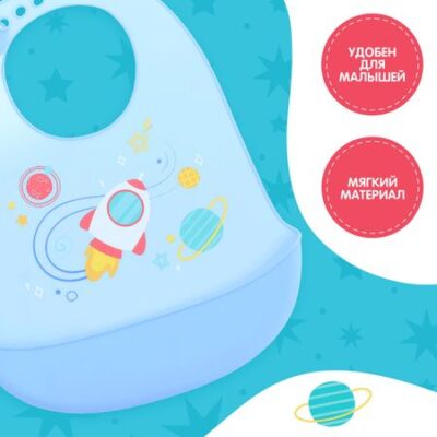 Нагрудник для кормления «Космос», силиконовый, с карманом, голубой. Мягкий силиконовый нагрудник — это надежный защитник при кормлении вашего малыша. Наличие кармашка не даст еде упасть на стол или на пол, а также убережет одежду малыша от загрязнений и пятен. <b> Основные преимущества:</b> <ul> <li> Мягкий на ощупь, имеет закругленные края: не поцарапает и не натрет нежную кожу ребенка.</li> <li> Есть кармашек, куда попадают все крошки.</li> <li> Удобный и легкий: легко сгибается, можно брать с собой.</li> <li> Изготовлен из безопасного и гипоаллергенного материала – пищевого силикона.</li> <li> Водонепроницаемый и грязеотталкивающий, не впитывает запахи и легко моется.</li> <li> Фиксируется за шеей с помощью застежки. Можно регулировать уровень положения нагрудника в зависимости от роста малыша.</li> <li> Размеры изделия: 24 × 1 × 31 см.</li> </ul> После использования мойте нагрудник теплой мыльной водой. Нагрудник рекомендован для детей от 0 месяцев.