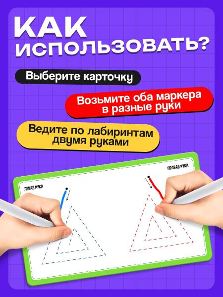 Напиши и сотри «Межполушарное развитие» лабиринты и круги. Развивающий набор «Напиши и сотри. Межполушарное развитие» поможет малышам от 3 лет в развитии обоих полушарий мозга в равной степени. Ребенок научится рисовать двумя руками одновременно, подготовит руку к письму, а также потренирует логическое мышление и память. <b> Особенности набора</b> <ul> <li> В комплекте 2 маркера и карточки с 20 интересными заданиями.</li> <li> Разные цвета маркеров помогут ребенку облегчить зрительный контроль над действиями на карточках. Начало движения отмечено на точках, а направления линий показаны стрелочками.</li> <li> Цель игры — нарисовать двумя руками симметричные картинки.</li> <li> Карточки имеют специальное покрытие, которое позволяет писать и стирать много раз.</li> </ul> <b> Как использовать набор</b> <ul> <li> Сначала покажите ребенку пример выполнения задания.</li> <li> Каждое задание необходимо выполнять двумя руками одновременно. Используйте для этого 2 маркера из набора, разные цвета которых позволяют облегчить зрительный контроль над действиями.</li> <li> Начало движения отмечено точками, а направления линий показаны стрелочками, ориентируйте на них.</li> <li> Если выполнить задание с первого раза не получится, то ничего страшного. Ведь на карточках есть специальное покрытие, которое позволяет писать и стирать много-много раз.</li> </ul> <b> Польза занятий с развивающим набором «Напиши и сотри. Межполушарное развитие»</b> С этой игрой малыш в легкой форме потренирует логическое мышление, внимание, мелкую моторику рук и координацию движений.